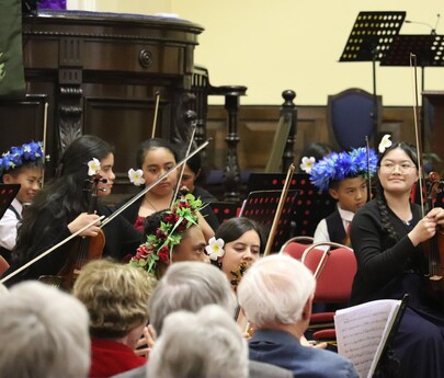 Pictured from left: Laie Nimarota (violin), Evie Patterson (double bass), Teddy Sneyd-Utting (viola), Chloe Shi (piano), Dylan Gao (violin), Rodi Ngwa (violin), Beaumia Limisio (viola).